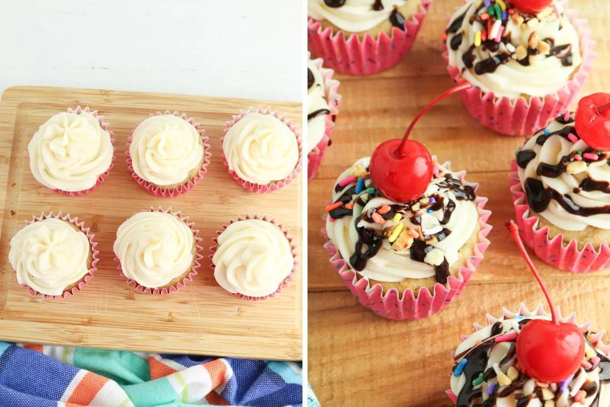 We topped the banana bread cupcakes with melted ice cream buttercream (YES, that’s a thing!), sprinkles, chocolate syrup, and a cherry on top.