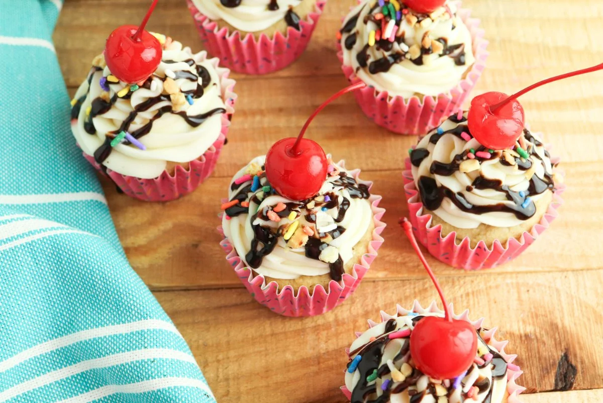 Scoop into cupcake liners, bake until golden, and once cooled, top with ice cream buttercream, chocolate syrup, sprinkles, cherries and nuts for the ultimate sundae-inspired treat!