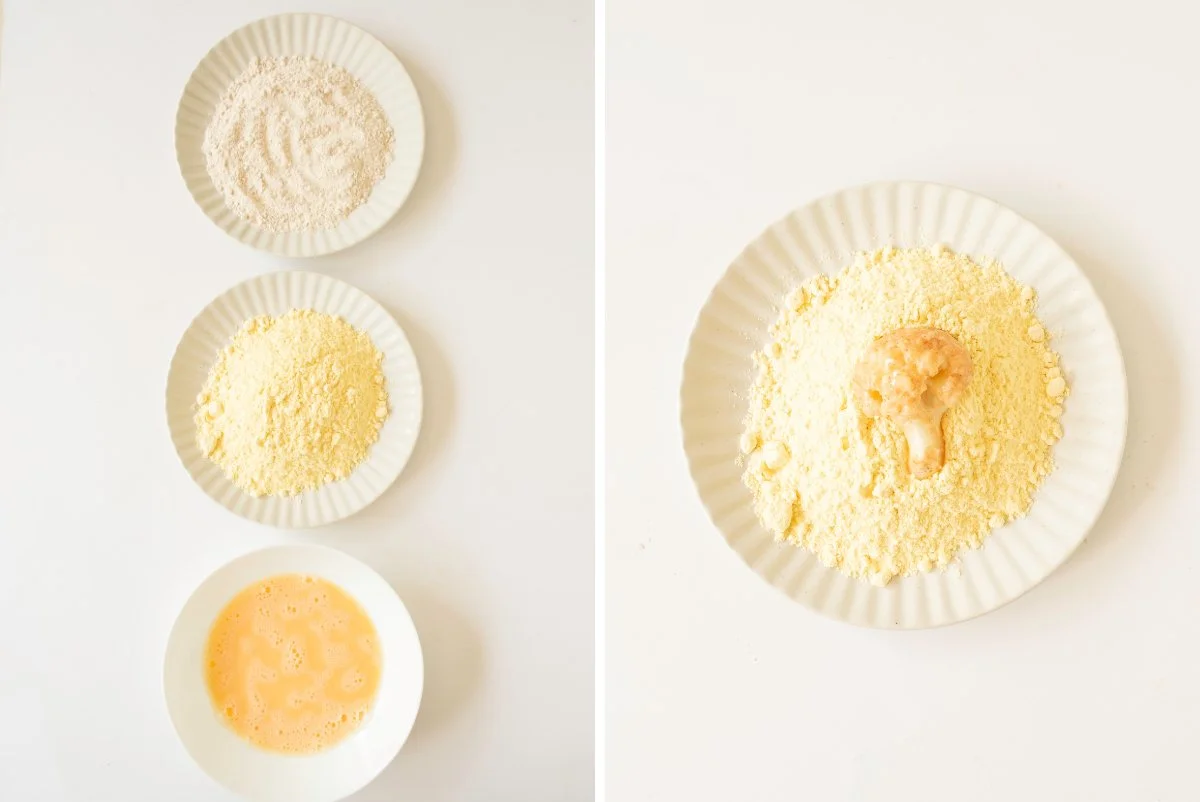 Roll each cauliflower floret in the seasoned flour, dip in egg and then coat with cornmeal.