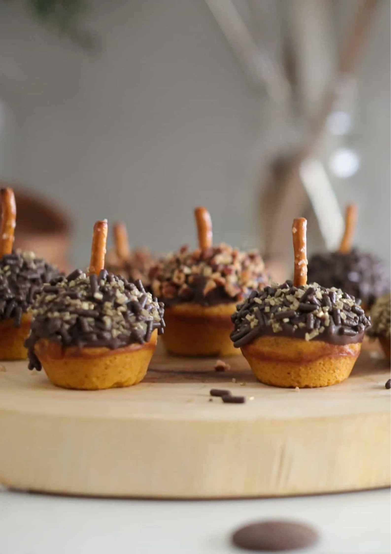 A homemade pumpkin muffin that is dipped in chocolate and topped with crushed pecans and sprinkles to look like an acorn. The perfect fall muffin recipe for kids and adults.