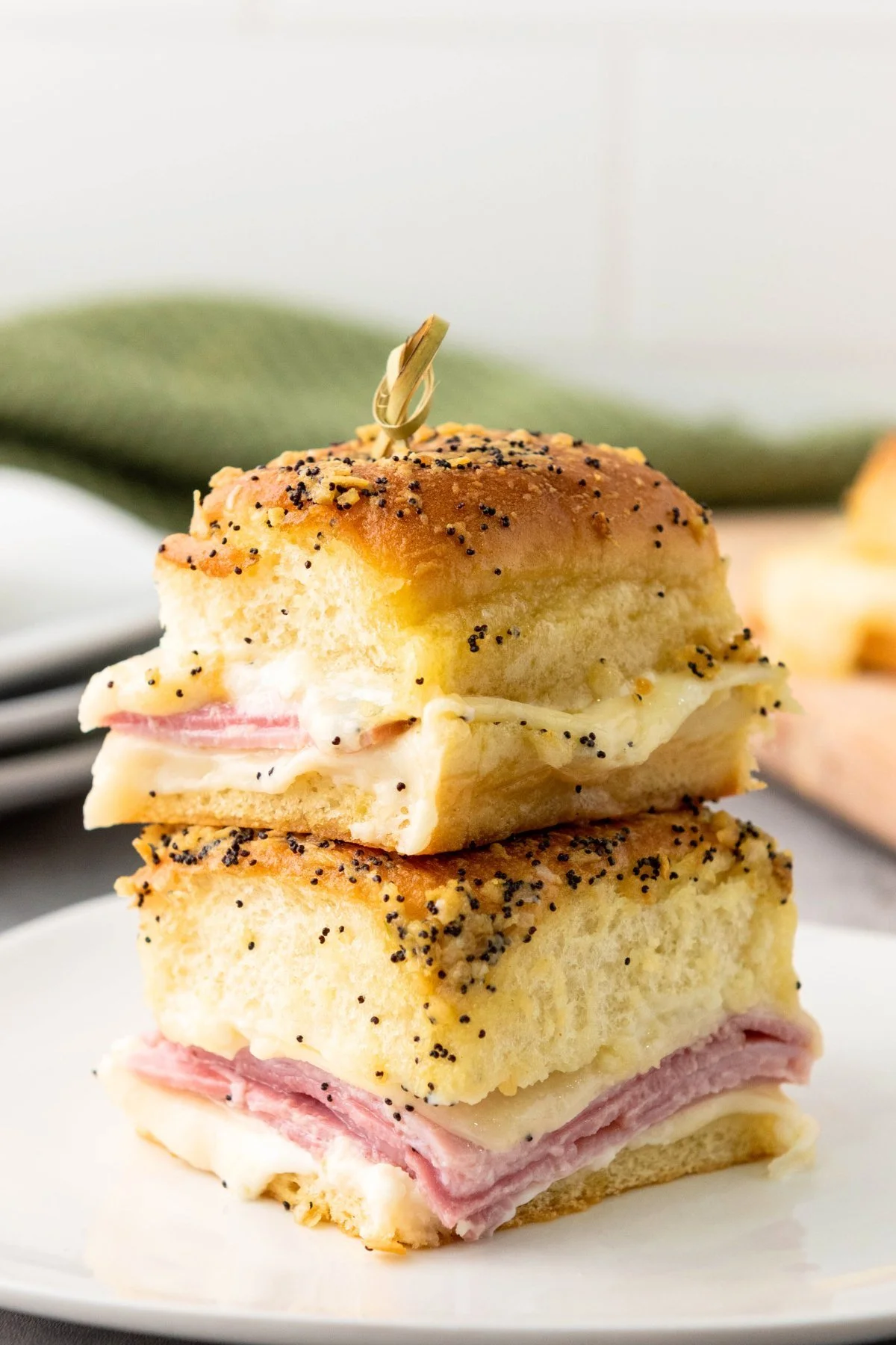 These Hot Ham & Cheese Sliders are the ultimate party food! Made with sweet Hawaiian rolls, melted Swiss cheese, and a buttery Dijon poppy seed glaze, they're perfect for game day, birthdays or an easy weeknight dinner.