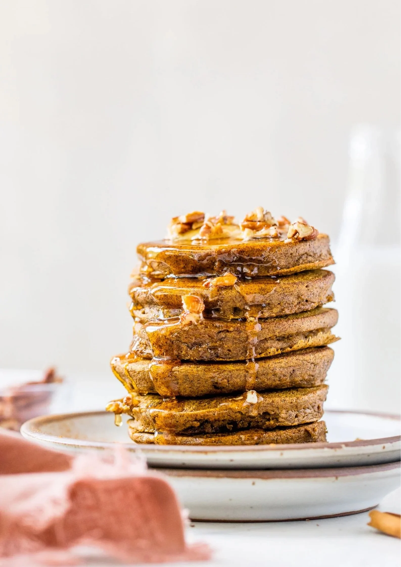 These pumpkin pancakes combine buckwheat flour, pumpkin, maple syrup, and a cozy lineup of fall spices.