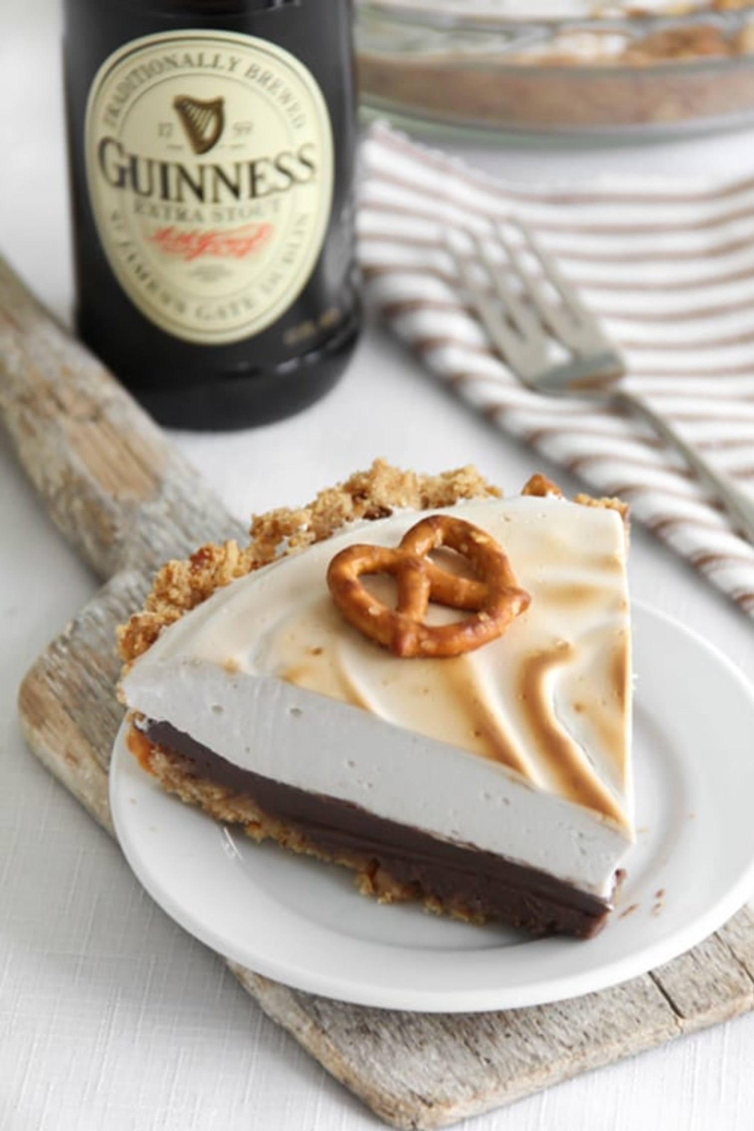 This Sweet and Salty Guinness Chocolate Pie features a crunchy pretzel-graham cracker crust filled with a rich chocolate pudding infused with Guinness stout. It’s topped with a gooey, toasted Guinness marshmallow meringue.
