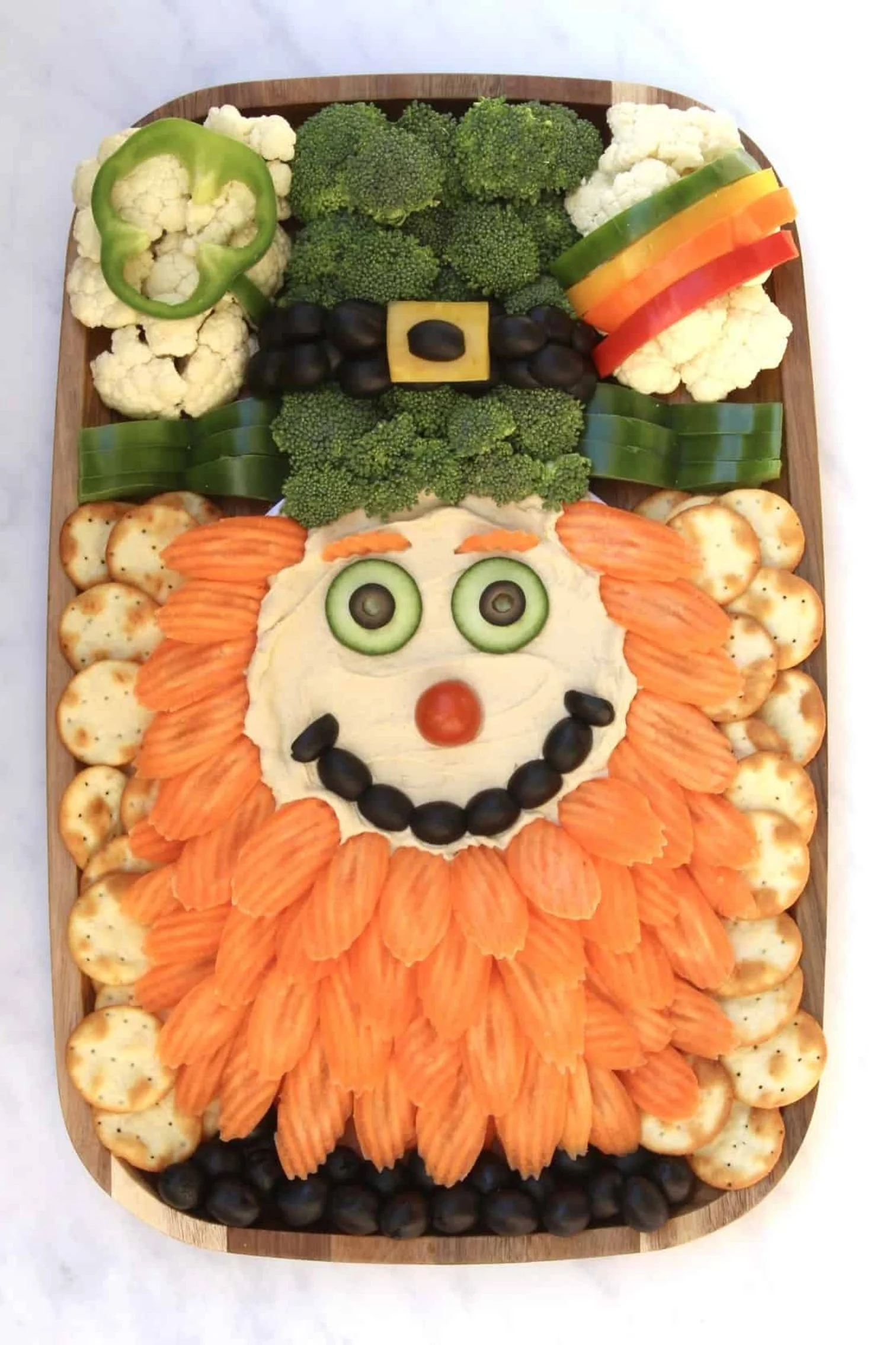 A festive Leprechaun Snack Board made out of hummus, veggies and crackers is so perfect for St. Patrick’s Day! It’s easy to make with healthy ingredients that everyone is sure to feel lucky snacking on.