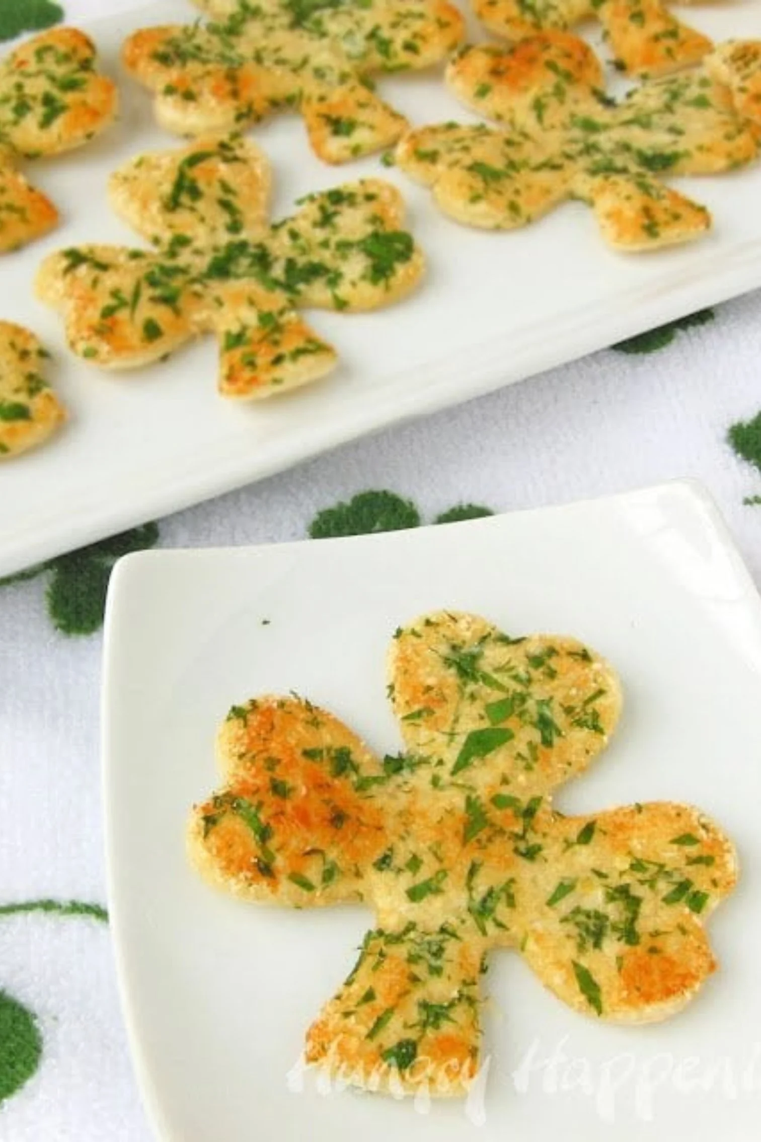 Looking for a savory appetizer to make for St. Patrick's Day? Try these Shamrock Shaped Snack Crisps. Each crispy cracker made from pie crust is topped with Parmesan cheese and green parsley.