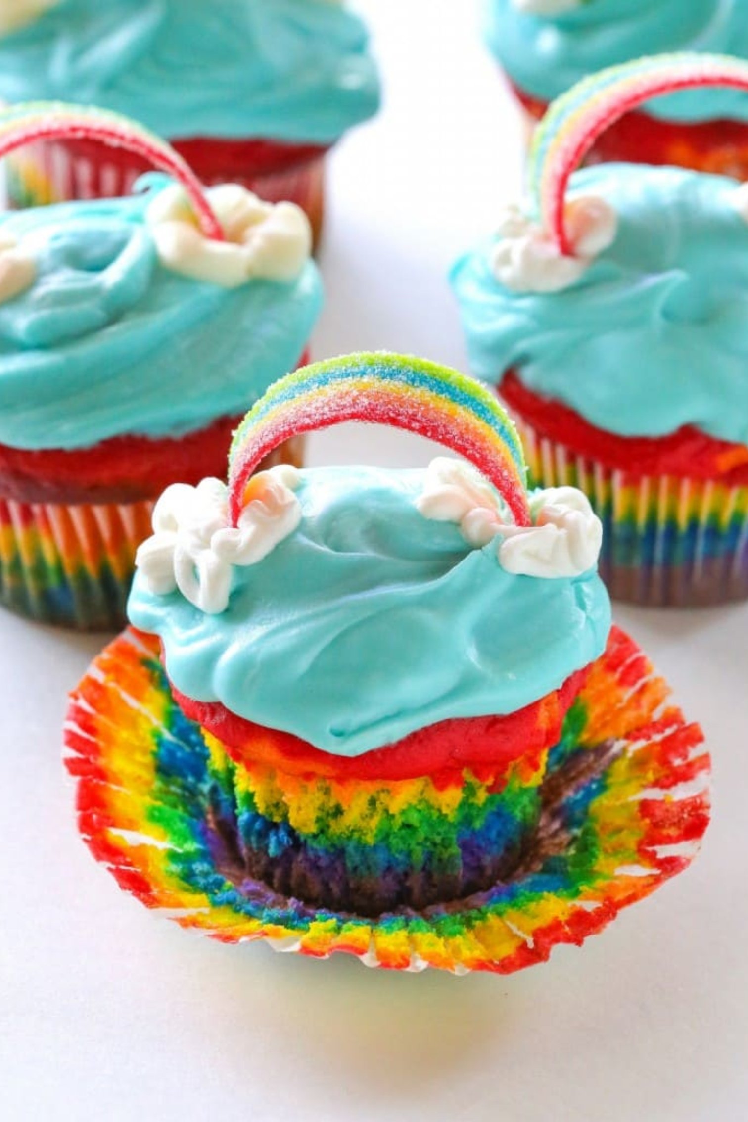Rainbow Cupcakes is a dessert that has layers of rainbow cake with vibrant colors topped with a magical cloud of vanilla frosting and rainbow on top.