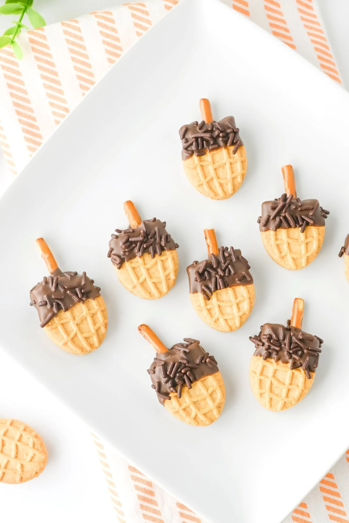 These adorable Nutter Butter Acorn Cookies are the perfect no-bake fall treat! Made with chocolate, sprinkles, and pretzel sticks, they’re fun to make and a hit at Thanksgiving or autumn parties.
