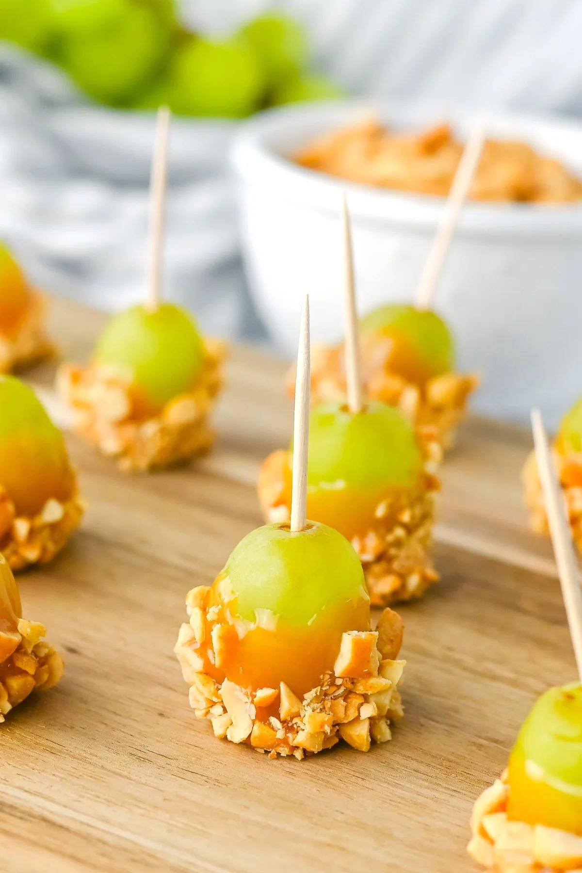 These Caramel Apple Grapes are a bite-sized twist on a traditional caramel apple but made with grapes, caramel and peanuts!