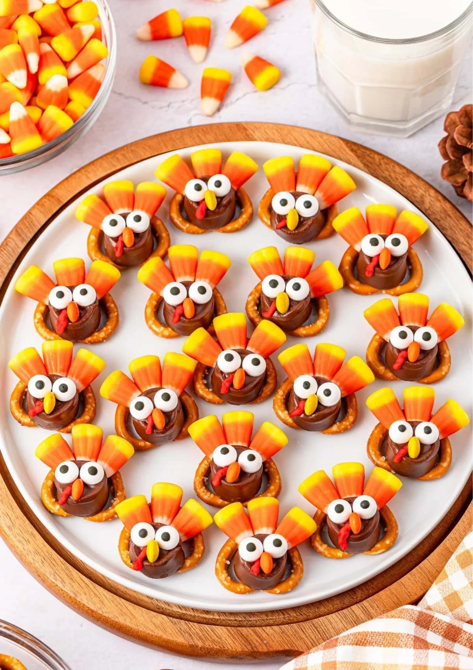 A mix of sweet treats, savory nibbles and kid-friendly Thanksgiving snacks ensures there’s something for everyone. Think mini pumpkin cheese and cracker pies, turkey-shaped cheeseballs and turkey pretzel treats.