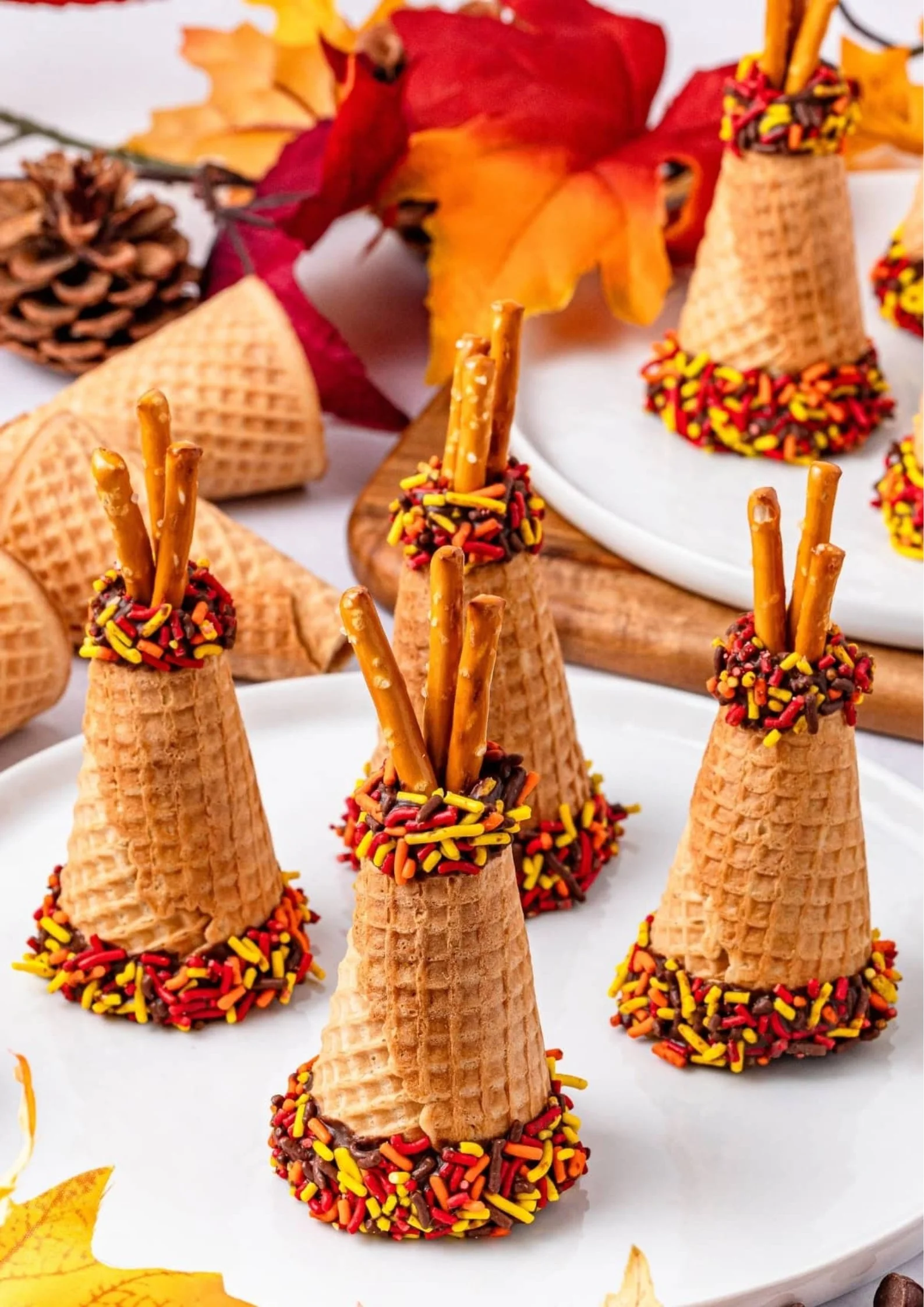 Looking for a fun fall dessert that’s sure to impress? This adorable chocolate dipped Teepee Sugar Cone Recipe takes just 15 minutes to prepare (plus decorating time) and are perfect for autumn parties or Thanksgiving celebrations.