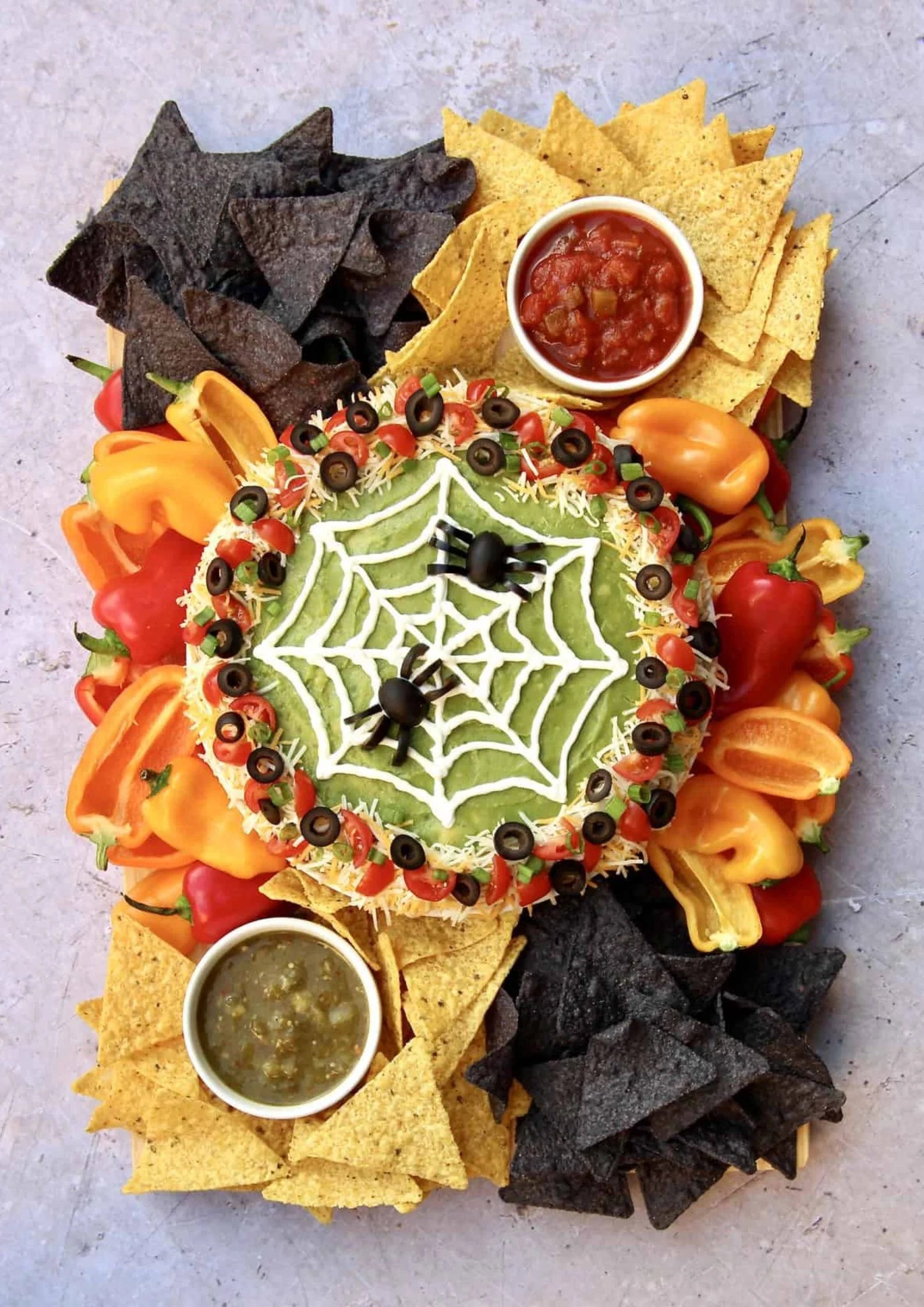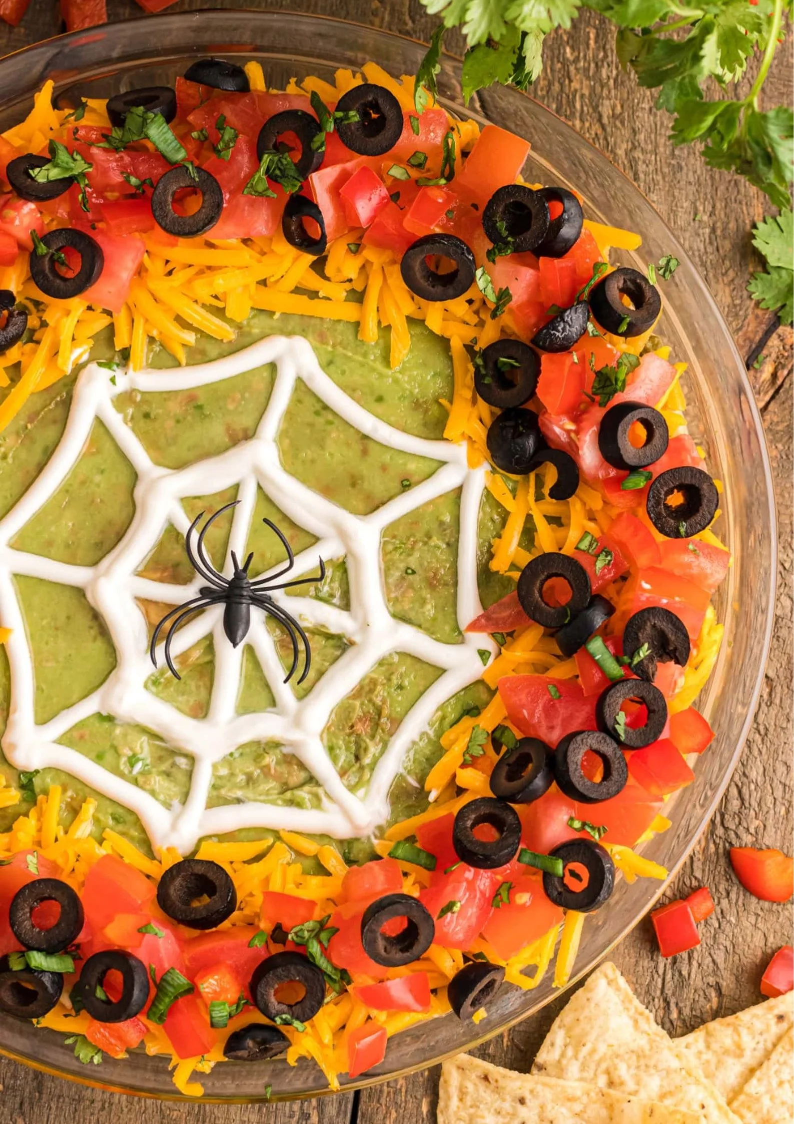 Take your party snacks to haunting new heights with my easy-to-make Spiderweb Seven Layer Dip Board! With black olive spiders and a sour cream web, this super spooky twist on a favorite will leave your guests in awe!