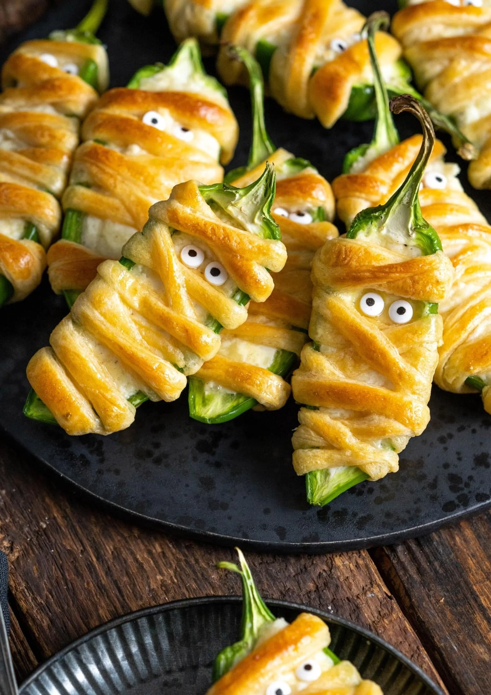 Adorably spooky Jalapeno Popper Mummies are super easy to make with a mixture of cream cheese, seasonings, and Monterey jack cheese stuffed inside a jalapeno pepper and wrapped snuggly inside flaky crescent dough strips.