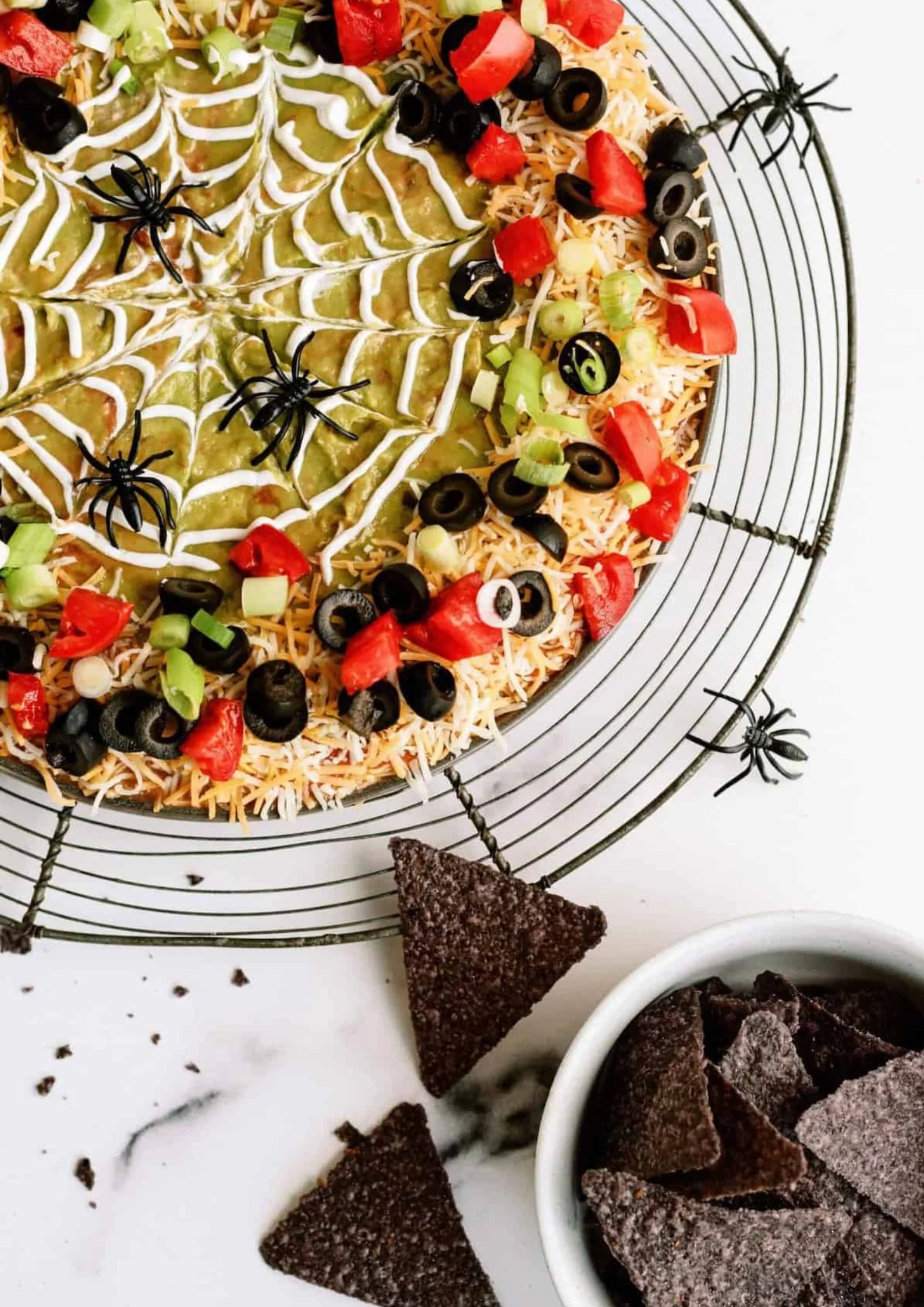 This Spooky Halloween 7-Layer Dip is a the ideal holiday appetizer with refried beans, sour cream, salsa, cheese, tomatoes, and guacamole.