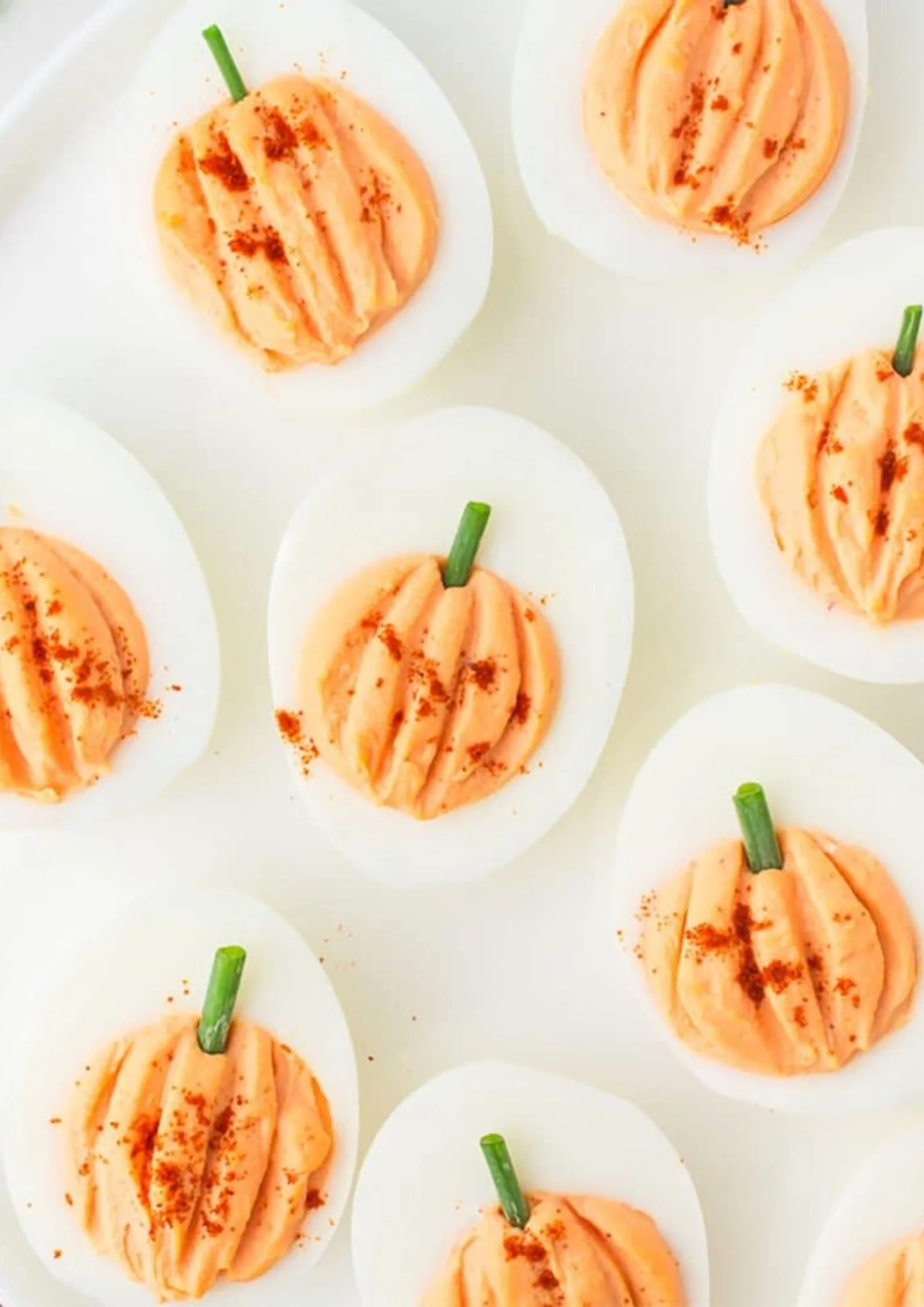 A fun fall take on classic deviled eggs, these easy Pumpkin Deviled Eggs are the perfect appetizer for Halloween, Thanksgiving, or any fall gathering.