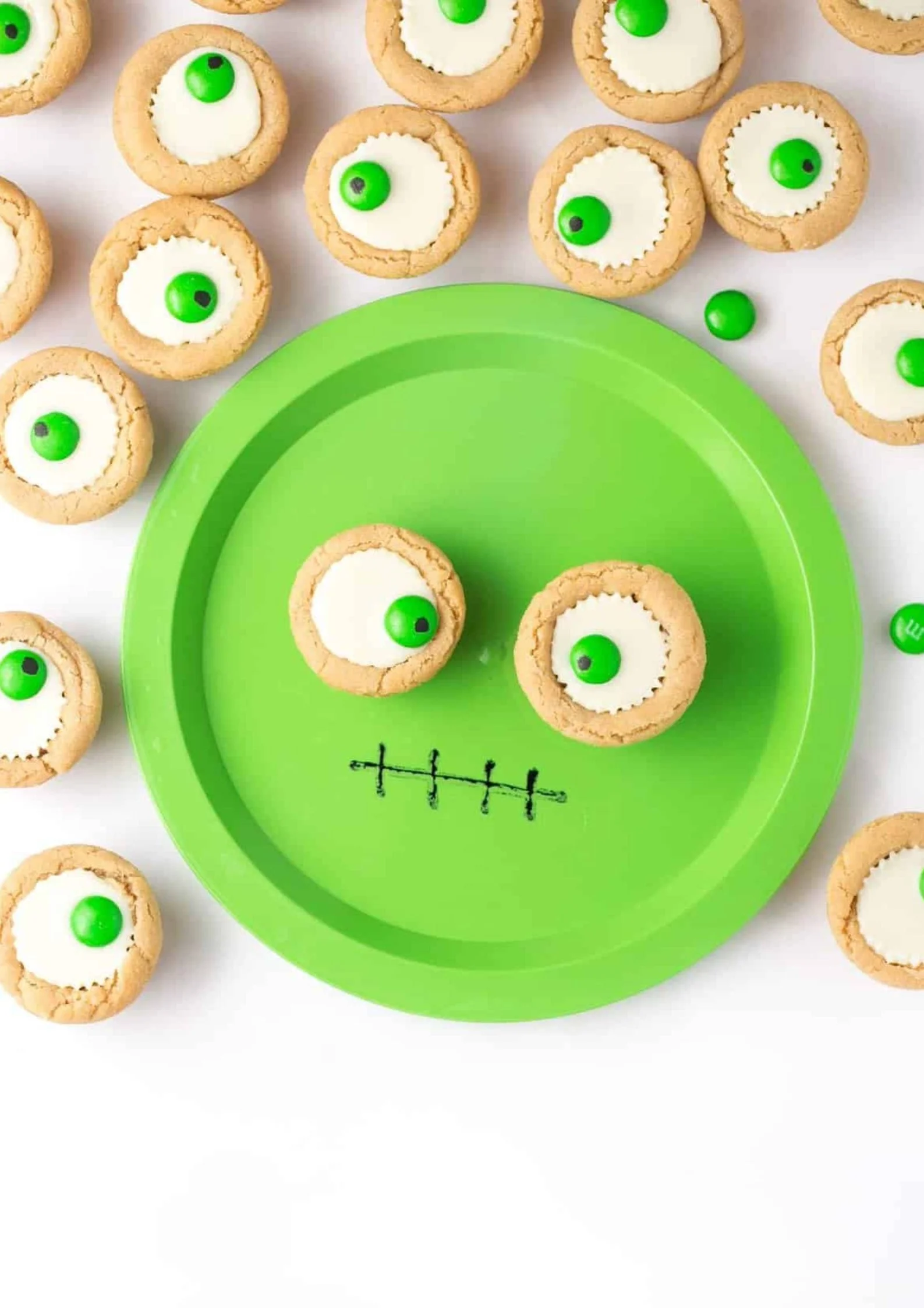 Ditch the fancy decorating - these easy Peanut Butter Cup Eyeball Cookies are easy to make with the kids! After baking, simply press a miniature white peanut butter cup and M&M into the top of each one for a spooky (but cute!) Halloween cookie idea.