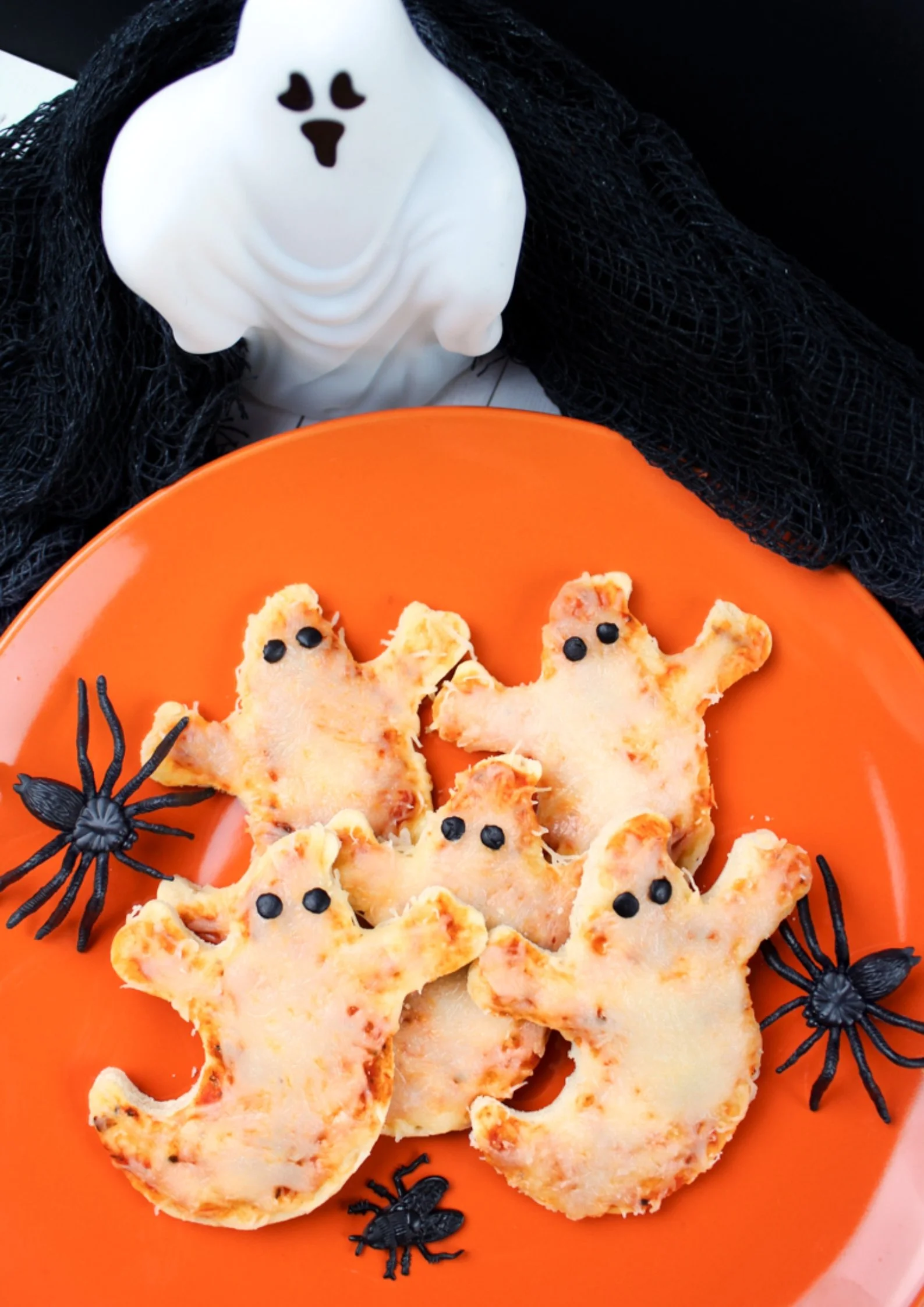 Ghost Shaped Pizzas with olive eyes are a quick and easy Halloween dinner idea that the kids will love. They would also be a hit with all the little ghosts and ghouls at your Halloween party!