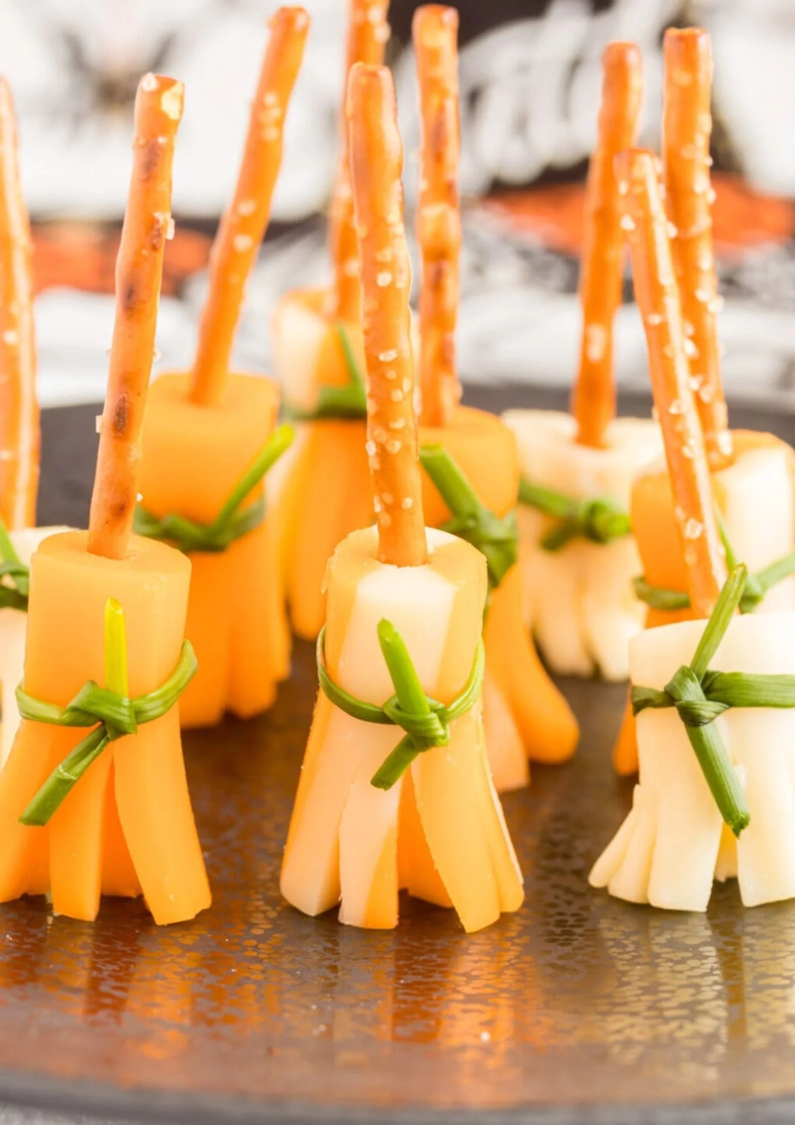 Quick and easy Cheese and Pretzel Broomsticks are always a hit at Halloween parties! With only 3 ingredients, these witchy broomsticks are a fun and healthy snack for kids and adults alike.