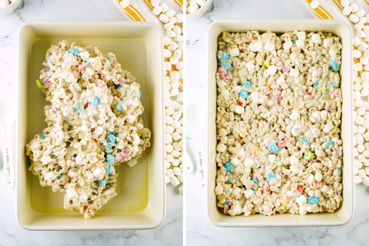 7. Sprinkle the remaining Lucky Charms over the top and lightly press down. Any extra marshmallows can also be added.