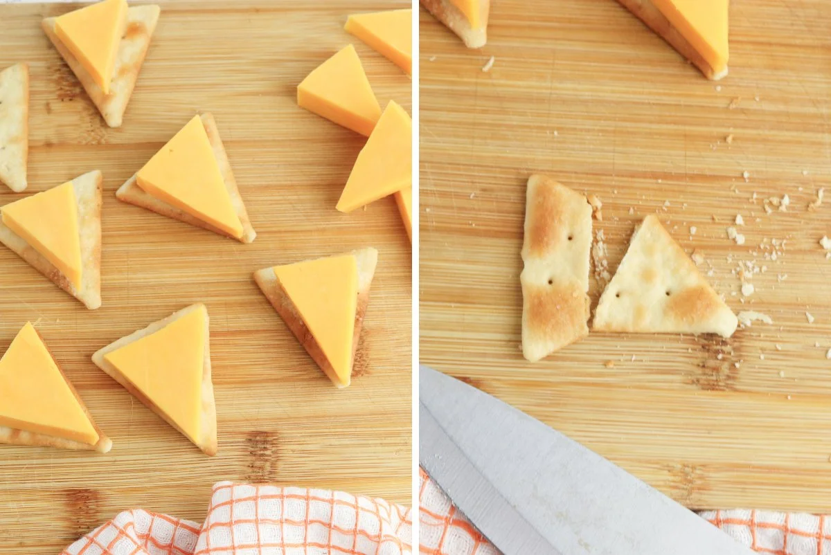 1. Cut the block of cheddar horizontally to make two thinner slabs. Then cut each slab into triangle ‘pie slice’ shapes that will fit neatly on top of the pita crackers.