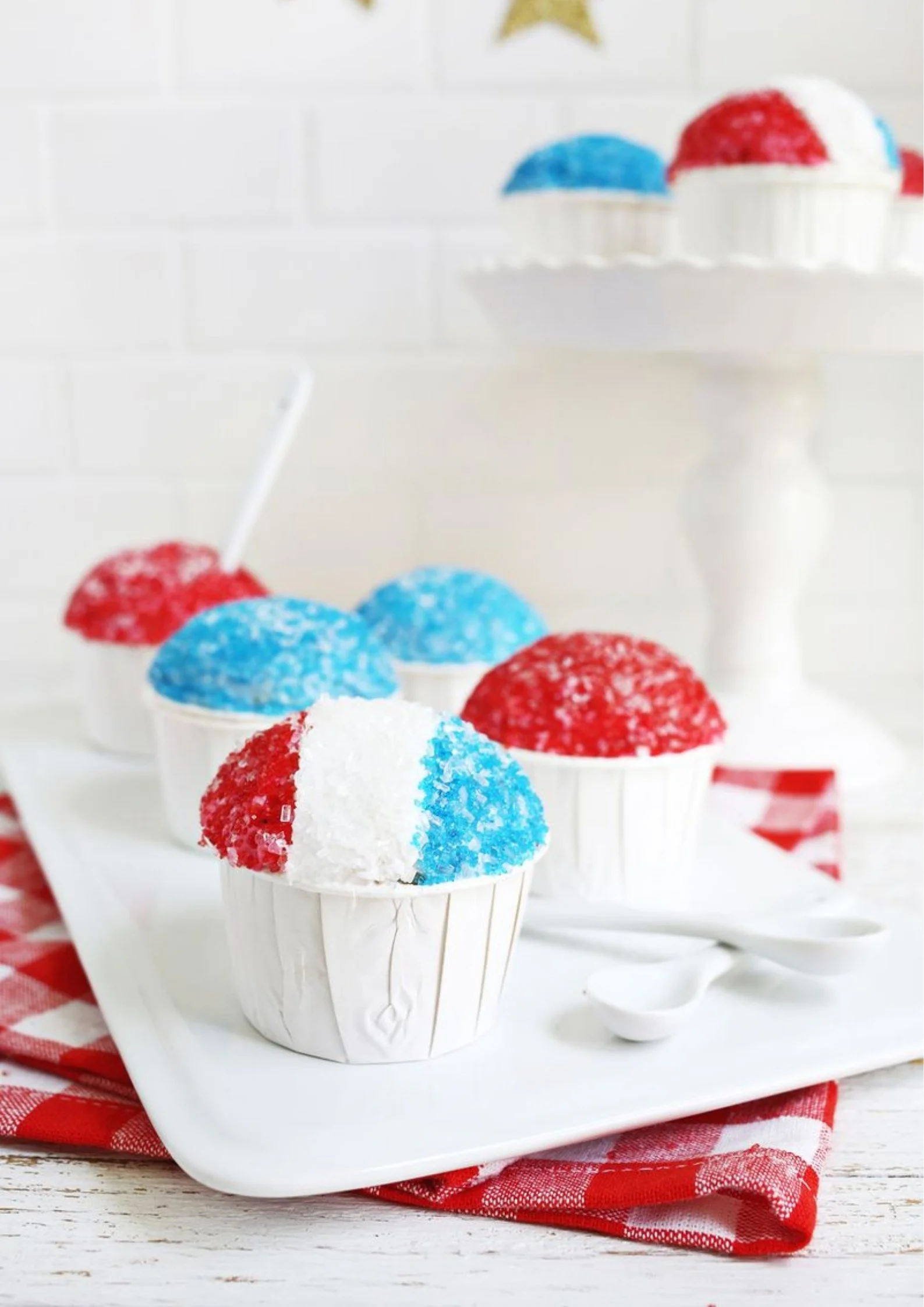 I love seeing all the fun red, white and blue foods and treats that people come up with for their celebrations, but when I saw that you can make cupcakes look like snow cones, I knew I had found the winner for this year’s celebration.